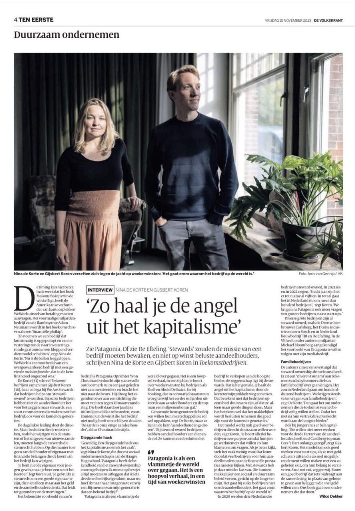 Niet de geldhonger van aandeelhouders, maar de belangen van de organisatie zelf en andere betrokkenen zouden de drijfveer moeten zijn achter de keuzes van bedrijven, vinden Gijsbert Koren en Nina de Korte, auteurs van het boek Toekomstbedrijven.