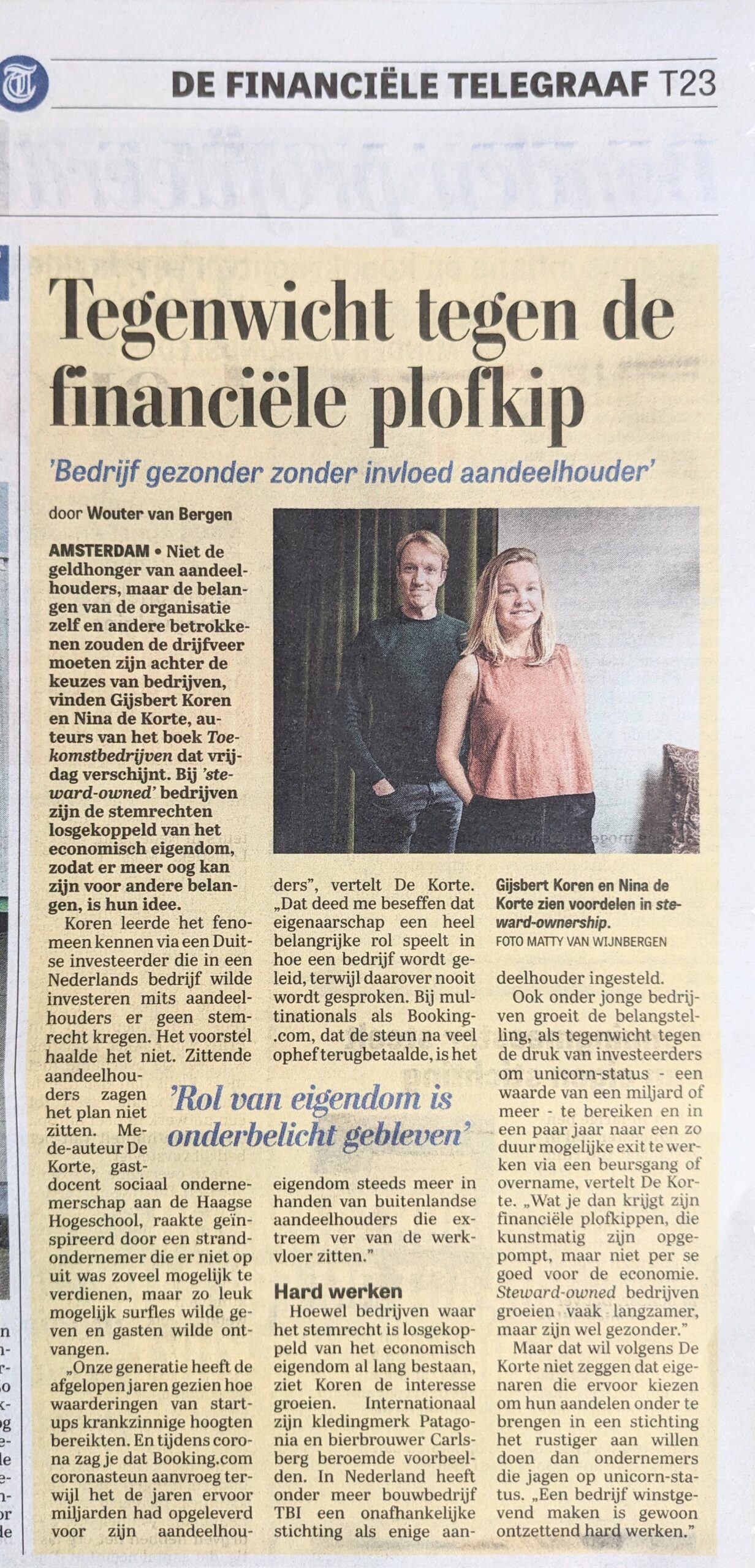 Niet de geldhonger van aandeelhouders, maar de belangen van de organisatie zelf en andere betrokkenen zouden de drijfveer moeten zijn achter de keuzes van bedrijven, vinden Gijsbert Koren en Nina de Korte, auteurs van het boek Toekomstbedrijven.